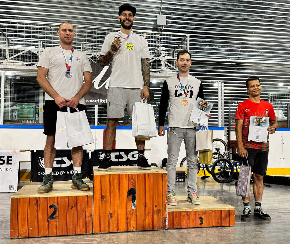 Péter Kádár was chasing for the podium but just missed it; also, a young junior rider moving up. Attila Bordács took second with some familiar front- and back-wheel rolling tricks. Solid old-school tricks gave Tamás Koncsecskó the third place.