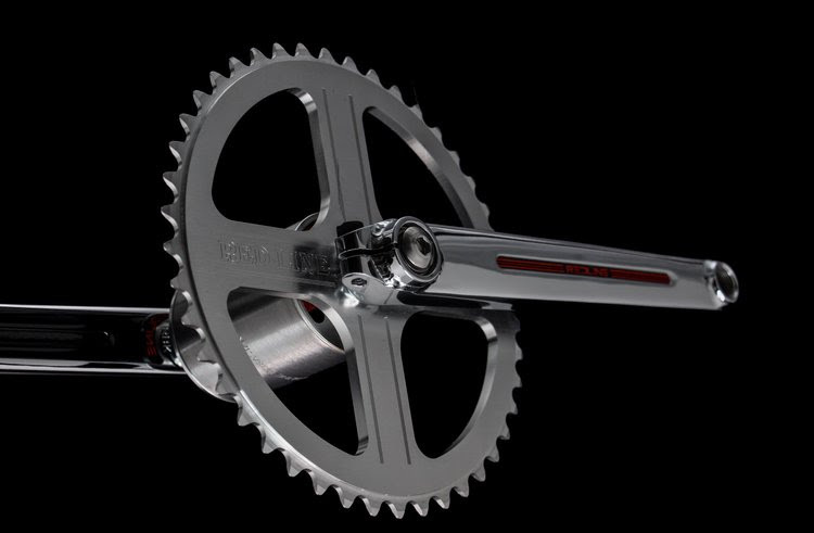 The Chrome Crank and BB sets include a classic silver anodized bubble font Redline 44t Flight Sprocket, the Double Dimple 8 Spline spindle, and a IJK sealed bearing Redline Vintage Techmatic Bottom Bracket set with silver cups.
